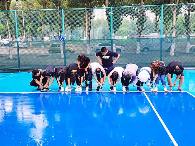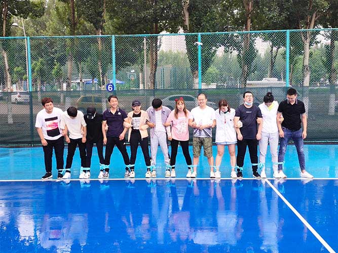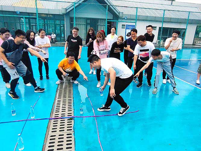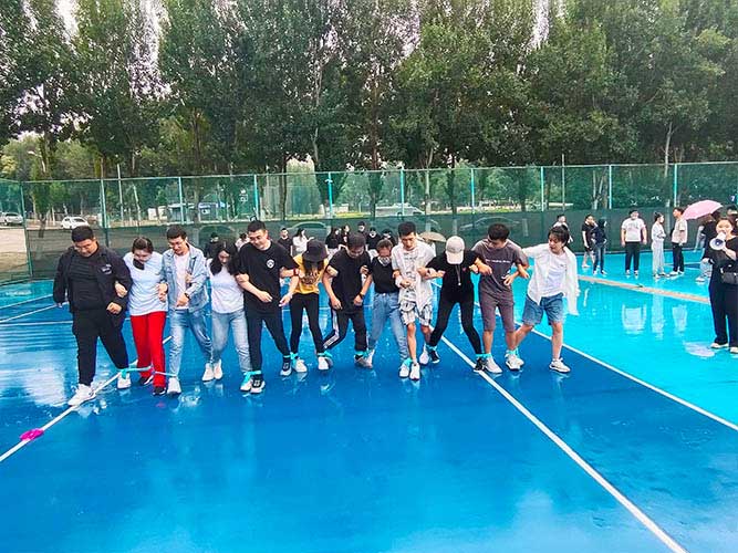 大家一排站好,從左到右,每人的右腿與另一人的左腿依次并齊,并用扁帶繩子系上,繩子綁的位置是腳踝以上部分。聽見哨聲即為游戲開始,從起點(diǎn)到終點(diǎn),按用時(shí)由短到長(zhǎng),取前五名依次加分。